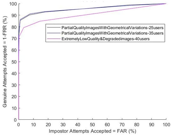 Figure 9. Receiver operating characteristic curve (ROC): The comparison between FAR and GAR in palm print segments images with partial-quality and extremely degraded images with geometrical variations. Note that the extremely degraded images are categorized by applying a criteria of having an exceptionally large number of minutiae beyond a range.