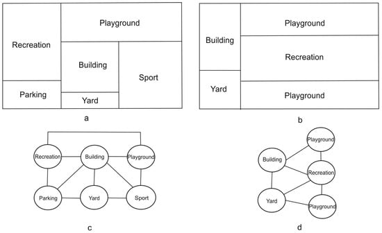 Ground layouts of kindergarten facilities consist of various arrangements of required areas. Each layout can be composed of six possible types of areas representing spaces intended for a kindergarten building, yard, playgrounds, recreational areas, sports facilities, and parking lots. At first, the manager agent generates an initial non-hierarchical graph representing a ground layout. If the specified requirements are fulfilled by this layout, the agent activates other agents which start from the initial nodes with communication labels and apply grammar rules to generate graphs representing the layouts of particular areas. The returned graphs are located in the respective nodes of the initial graph, which becomes a hierarchical one. Two possible layouts of kindergarten facilities with the graphs representing them are presented in Figure 2. The labels Building, Playground, Recreation, and Sport activate the agents designing the areas with specific purposes. The layout presented in Figure 2b contains two areas labelled Playground, as one of them is intended for younger children, while the second one is for older children. If at the beginning of the design there is a requirement for two playgrounds, only the layout from Figure 2b meets this condition.