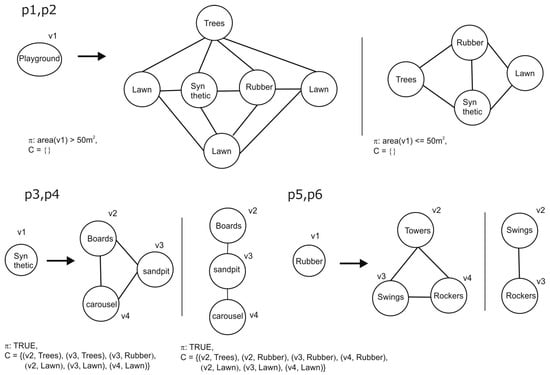 Six selected rules of an NCE graph grammar generating layouts with various arrangements of playground facilities are presented in Figure 3. Non-terminal labels of nodes start with a capital letter, while terminal labels are written in lower case letters. The area of the spaces and the material used for the different types of beddings are specified by the graph attributes. The rules p1 and p2 generate arrangements of areas with beddings filled with grass (nodes labelled by Lawn), rubber mat (Rubber), synthetic grass (Synthetic), and areas to be planted with trees (Trees). The first rule can be applied when the value of the attribute area of the node v1 is greater than 50 m2. Rules p3 and p4 generate arrangements of sandpits, carousels, and outdoor boards located on the synthetic grass, while rules p5 and p6 generate arrangements of swings, activity towers, and spring rockers located on rubber mats. For clarity, the embedding transformation is depicted only for rules p3 and p4.
