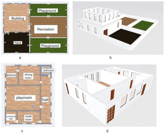 (a) A view of kindergarten grounds; (b) a 3D view of these grounds; (c) a detailed view of the ground floor; (d) a 3D view of the ground floor.
