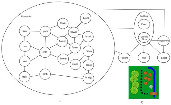 (a) A hierarchical graph generated by the manager agent by combining agents’ solutions; (b) a recreation area arrangement.