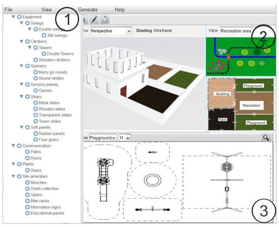 A visualisation of a solution which consists of a two-story building, a facility layout with two playgrounds, a recreation area, and a yard is shown in Figure 8. In the top-right panels (number 2) different parts of the solution, like the building with the grounds, facility layout, recreation area, sports area, or building floor layouts, can be visualised. In the bottom-right panel (number 3) the area which can be currently modified by the designer is shown. The presented playground is composed of a tower with a slide, rocket, swings, springboard, and a seesaw. In panel number 1, the hierarchy of all possible components that can be placed in the playground is listed.