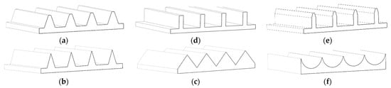 Figure 1. Conventional riblet geometries: (a) trapezoidal, (b) spaced triangular, (c) triangular, (d) bladed, (e) trapezoidal bladed, and (f) semi-circular.