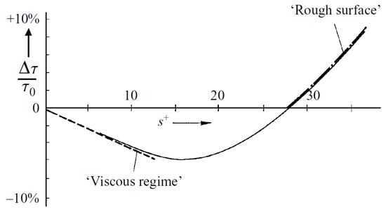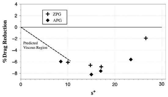 As the reduction in wetted area is the main concept behind drag reduction, the number of indentations per unit of length should be within an optimum range [21]. The effect of non-dimensional spacing, s + , in drag reduction for a triangular riblet geometry with peak sharpness of 60° is illustrated in Figure 2. The figure indicates the limit of drag reduction when riblets spacing tends to be zero. Drag reduction achieves its optimum values at about s + 15 . Increasing s + further would result in decreased effectiveness, causing an increase in drag more than zero, which is defined in the figure as a rough surface [35].
