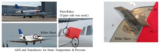 104. Kurita, M.; Nishizawa, A.; Kwak, D.; Iijima, H.; Iijima, Y.; Takahashi, H.; Sasamori, M.; Abe, H.; Koga, S.; Nakakita, K. Flight Test of a Paint-Riblet for Reducing Skin-Friction. In Proceedings of the 2018 Applied Aerodynamics Conference, Atlanta, GA, USA, 25–29 June 2018. [Google Scholar] [CrossRef]