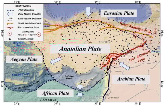 Turkey is located at the convergence of Eurasia, on the Anatolian Plate, which is affected by the interaction of several adjacent plates and fault zones [14], as shown in Figure 1: The Arabian Plate squeezes the Anatolian Plate to the northwest, forming the East Anatolian Fault Zone that is the most active fault zone in Turkey in recent years; The African Plate, located south of Turkey, subducts northward under the Eurasian Plate, forming the Greek Island Arc, which is the most active subduction zone in Europe; The Eurasian Plate, located north of Turkey, compresses Turkey’s northern part southward, forming the North Anatolian Fault Zone, which is a right-lateral strike-slip fault zone extending from the northwest of Turkey to the east of Georgia, and also the longest fault zone in Turkey [15,16,17].