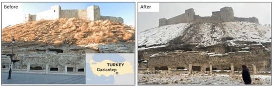 Comparison of Gaziantep Castle before (left) and after (right) the earthquake, showing the damage to the walls and towers. The images were obtained from Google Earth Pro, with the lat long coordinates of 37°04′ N, 37°23′ E.