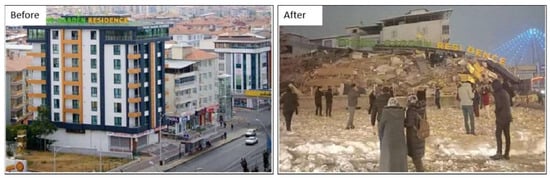 Comparison of Trend Garden Residence Hotel before (left) and after (right) the earthquake, showing the collapse of the building. The images were obtained from Google Earth Pro, with the lat long coordinates of 38°20′ N, 38°17′ E.