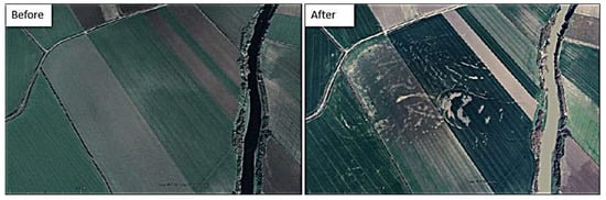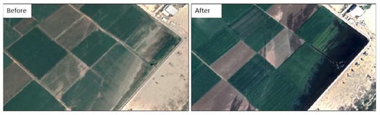 Comparison of site liquefaction before (left) and after (right) the earthquake, showing the formation and expulsion of water and sand on a flat area. The images were obtained from Google Earth Pro, with the lat long coordinates of 36°15′ N, 36°14′ E and the date of 22 December 2022 (before) and 14 February 2023.