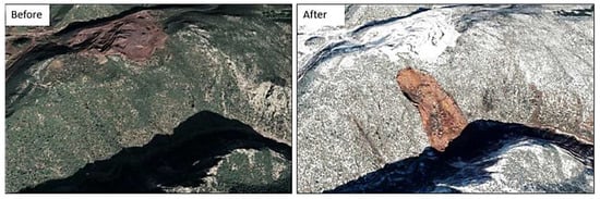 Comparison of a landslide before (left) and after (right) the earthquake, showing the movement and deposition of soil and rocks on a slope. The images were obtained from Google Earth Pro, with the lat long coordinates of 37°00′ N, 36°35′ E and the date of 27 December 2022 (before) and 7 February 2023.
