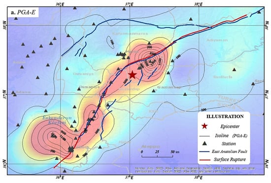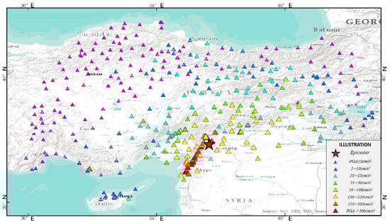 The strong motion data utilized in this study were acquired from Turkey’s Disaster and Emergency Management Authority (AFAD). The AFAD operates the National Strong Motion Network that consists of 762 stations distributed all over Turkey. The network records the ground acceleration during earthquakes with magnitudes greater than 3.0. The data are stored and transmitted in a MiniSEED format, which contains the waveform samples, the station metadata, and the timing information. Following the occurrence of the earthquake, the aforementioned agency promptly disseminated pertinent strong motion record data on its official website. Subsequently, the data underwent several calibrations and updates [26]. The data used in this study are from the version published on 1 June 2023, comprising records from 379 stations. The distribution of peak ground acceleration (PGA) and station locations is shown in Figure 7. The strong motion instruments and sensor models for each station are listed below. There are a total of 87 stations that are equipped with the GEOSIG GMS AC-73 seismic instrument. Additionally, there are 140 stations that utilize the Guralp CMG-5T instrument. Furthermore, there are 107 stations that make use of the SARA ACEBOX sa10 instrument. Lastly, there are 45 stations that employ various other seismic instruments [27]. Table 2 presents a compilation of strong motion records acquired from the earthquake under consideration. The table includes relevant details such as station numbers, latitude and longitude coordinates, peak ground acceleration (PGA) values, epicentral distances, fault distances, and station locations. This information has been included in the table due to spatial constraints.