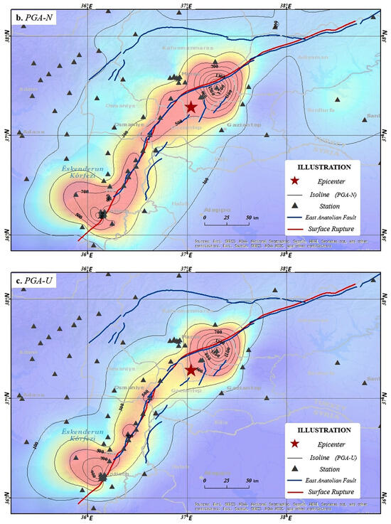 Isoline Map of PGA for the 2023 Turkey Earthquake (Mw7.8). (This map illustrates the distribution of peak ground acceleration observed in this earthquake with a contour interval of 100 mm/s2. (a–c) are the isopleth maps of peak ground acceleration corresponding to the east–west component, the north–south component, and the vertical component, respectively. The blue lines represent the segments of the East Anatolian fault that ruptured during the earthquake, as well as some adjacent segments that did not rupture but are considered active. The surface rupture is taken from AFAD (2023) “Preliminary Evaluation Report on 6 February 2023 Pazarcik (Kahramanmaraş) Mw 7.7 Elbistan (Kahramanmaraş) Mw 7.6 Earthquakes”).