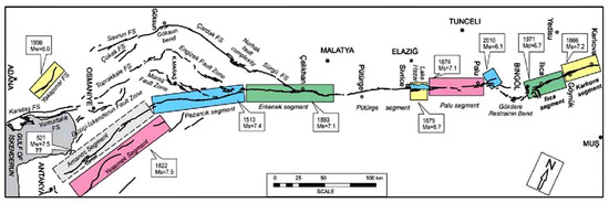 Schematic diagram of surface rupture segments and earthquake of the East Anatolian Fault and its sub-segments [39].