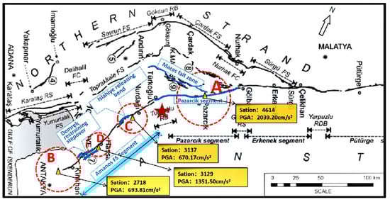 According to the illustration presented in Figure 11, the East Anatolian Main Fault exhibits a division into nine secondary sub-faults. These sub-faults encompass the Amanos FS Segment and the Pazarcik Segment. Every individual sub-fault demonstrates distinct characteristics, including the occurrence of folding and overlapping. Duman et al. (2013) [39], based on active fault mapping and utilizing seismic data from Turkey, confirmed the discontinuous segmented structure of the East Anatolian Fault Zone and inferred that each segment has a different slip rate, rupture length, and recurrence interval. Additionally, the authors provided further details regarding the geometric segmentation, intermittent nature of activity, and regional characteristics associated with induced earthquakes and suggested that these factors affect the seismic hazard assessment of the region. These inferences are important for our research work because they help us understand the spatial distribution and variation in ground motion along the East Anatolian Fault Zone and its sub-faults.