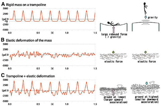 The trampoline effect refers to the phenomenon that when seismic waves reach the ground surface, the surface layer will be compressed and bounced up, just like a trampoline. When the surface layer recovers its elasticity, it will produce an upward reaction force, which will increase the ground acceleration (as shown in Figure 13). The trampoline effect was first observed in the 2008 Mw6.9 Iwate-Miyagi earthquake in Japan [42], and later reported in other earthquakes, such as the 2010 Mw7.2 El Mayor-Cucapah earthquake in Mexico [43], and the 2016 Mw7.8 Kaikoura earthquake in New Zealand [44]. In these earthquakes, it was observed that the vertical acceleration was significantly larger than (or even several times larger than) the horizontal acceleration, and the vertical upward acceleration was significantly larger than the downward acceleration. Aoi S. et al. studied the 3866 cm/s2 vertical acceleration produced by the Mw6.9 Iwate-Miyagi earthquake on 14 June 2008 and found that the vertical ground acceleration showed a clear asymmetry, with the peak value in the upward direction being about 1.6 times that in the downward direction.