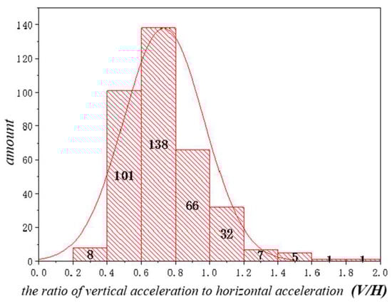 In seismic design, the influence of vertical ground motion on structural responses may need to be considered, and this influence is often specified by a certain ratio of horizontal ground motion [40]. Generally, the vertical acceleration is about 1/2 to 2/3 of the horizontal one [41]. With the development of strong motion technology, the number of strong motion stations has increased rapidly, and more near-field strong motion records have been obtained, giving people a deeper and more comprehensive understanding of strong motion records. Especially in recent years, more and more earthquake records with larger vertical peak accelerations have drawn people’s attention.