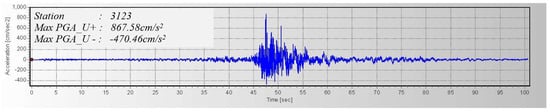 According to Table 2, the earthquake’s highest Peak Ground Acceleration (PGA) values were recorded at station 4614, which is situated in Kahramanmaraş City. Its PGA values in all three directions were the largest among all stations (north–south: 2039.20 cm/s2, east–west: 2016.99 cm/s2, vertical: 1582.62 cm/s2). We used SeismoSignal software (Version 5.1.0) to replot the data from station 4614, using a smoothing spline function to reduce noise and enhance clarity. Figure 8 displays the PGA time–history curve pertaining to station 4614. The PGA value of 1372.07 cm/s2, which ranks as the second-largest in the east–west direction, was documented at station 3135 in Arsuz. This measurement was obtained at a fault distance of 33.44 km. The second-largest north–south PGA value (1351.50 cm/s2) was recorded at station 3129 in Defne, with a fault distance of 2.42 km. The second-largest vertical PGA value (1151.56 cm/s2) was recorded at station 3129 in Hatay, with a fault distance of 5.15 km.