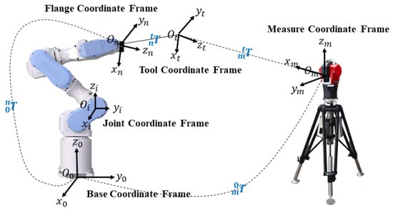 Industrial robot calibration is the process of identifying the structural parameters of the robot based on its end-effector error. It involves complex theoretical knowledge. In this section, the definitions of coordinate frames involved in the industrial robot calibration process are presented. Additionally, the practical significance of DH parameters and the MDH model are explained. Finally, the forward kinematics equation of industrial robots, the transformation matrix representing the tool coordinate frame relative to the flange coordinate frame, and the transformation matrix representing the base coordinate frame relative to the measurement coordinate frame are provided.