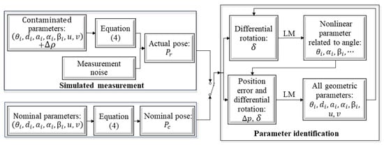 However, the majority of the aforementioned industrial robot calibration methods primarily focus on positional errors, neglecting the importance of orientation accuracy. Moreover, when the calibration of the tool coordinate frame and measurement coordinate frame is not sufficiently accurate (i.e., when there is a significant transformation error), the identification results based on the MDH error model often differ greatly from the actual structural parameters of the industrial robot [27]. Additionally, industrial robot parameter identification is susceptible to falling into local optima due to the effects of transformation errors in the tool coordinate frame and measurement coordinate frame and other random noise. To address these issues, this paper presents a more accurate error model and parameter calibration method for industrial robots based on 6-DOF position and orientation to identify the actual structural parameters. The main contributions are as follows: (1) based on the modified Denavit–Hartenberg parameters, the transformation errors of tool coordinate system and measurement coordinate frame were introduced to establish a geometric parameter error model, which uses positional and orientation accuracy as optimization objectives; (2) to overcome the problem of easily falling into local optima when identifying geometric parameters simultaneously, a geometric parameter cross-identification method based on the Levenberg-Marquardt algorithm is proposed; (3) the linear relationships between the parameters of the proposed geometric error model are investigated, and a solution for not calibrating some geometric parameters under specific conditions is provided.