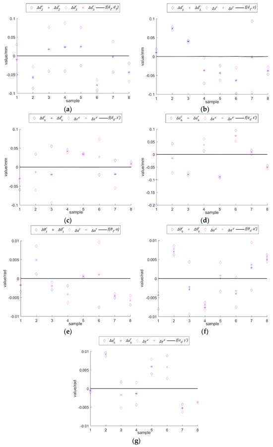 Based on the above analysis, the preliminary results showed that there is a linear relationship between and , as their deviations sum up to a constant value equal to the sum of the preset deviations. Similarly, it can be inferred that there are linear relationships between and ; and ; and ; and ; and ; and and . To further validate these judgments, while keeping the other geometric parameters constant, we continuously adjusted the preset deviations of and , and observed the value of , as shown in Figure 5a. Upon observation, it was found that, for different preset deviations and , the value of consistently remained at zero. This demonstrates that there exists a linear relationship between the link offsets and for the BRTIRUS0707A robot. Similarly, Figure 5 can also be used to determine the linear relationships between and ; and ; and ; and ; and ; and and .