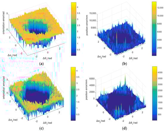 The global convergence regions of different algorithms under various initial values; (a) Orientation error of LM; (b) Position error of the LM; (c) Orientation error of C-LM; (d) Position error of the C-LM.