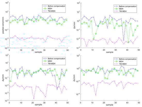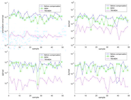 Set the errors of the link parameters as , , , , and Based on Equation (19), the geometric parameters error model (TM-MDH) can be established as follows: