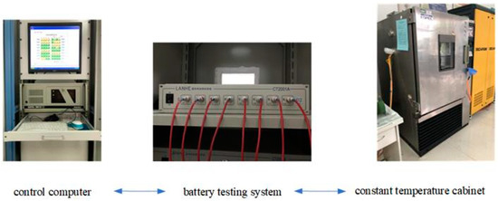 Experimental data were obtained from a LANHECT-2001 battery-testing system comprising a constant-temperature cabinet, a control computer, and a Samsung 18650 power lithium-ion battery with nickel–cobalt–manganese (NCM) positive electrode material, as shown in Figure 1. The specifications of the lithium-ion battery are listed in Table 1.