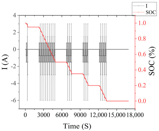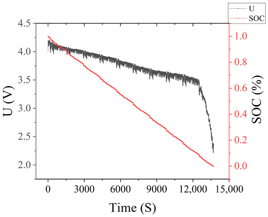 To verify the performance of the proposed algorithm, two discharge conditions were used in the experiments on UDDS and DST. All experiments were conducted at a constant temperature of 20 °C. The battery underwent 10 cycles of discharging from 100% to 0%, with current, voltage, and corresponding SOC recorded every second. Figure 2 shows voltage and battery SOC as a function of time in the UDDS experiment, and Figure 3 illustrates the current and battery SOC changes during the UDDS experiment. As shown in Figure 2, there was a sharp drop in voltage when the battery SOC was below 20%. The DST experiment involved higher discharge currents and longer discharge and resting times. Figure 4 shows the relationship between voltage and SOC during the DST experiment, and Figure 5 shows the relationship between current and SOC during the DST experiment as a function of time. Similar to Figure 2, a significant voltage drop was observed when the battery SOC was below 20% in Figure 4.