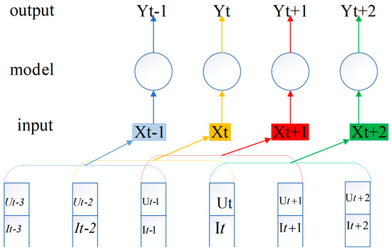 As shown in Figure 6, Xt-i denotes the discharge data at a given moment. When the sequence length is set to three, slicing operations are performed to obtain the input samples Xt = [Ut − 2, Ut − 1, Ut; It − 2, It − 1, It] such that each input sample Xt contains the current moment t and the discharge data of the battery in the previous two moments, t − 1 and t − 2. During the model-training process, historical data were used to predict the current SOC of the battery.