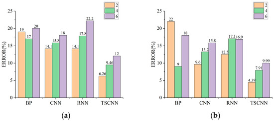 This study compared the performances of the CNN, BP, RNN, and TSCNN neural network models in estimating battery SOC, thereby validating the results for low battery levels. The effectiveness of the network architecture and the impact of the network depth on the accuracy of SOC estimation were evaluated. Network depth is an important factor that affects the performance of neural network models. In the experiments, by setting different network layers to 2, 4, and 6, the influence of network depth on model performance was explored. The specific comparison results are referred to as error fluctuations in Figure 12. By comparing the performances of the TSCNN, CNN, BP, and RNN models and setting different network depths, the advantages and disadvantages of different neural network models can be better assessed in handling drastic changes in current data, thereby providing a reference for practical applications.
