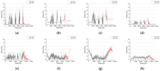 (a) Error of BP on DST; (b) error of CNN on DST; (c) error of RNN on DST; (d) error of TSCNN on DST; (e) error of BP on UDDS; (f) error of CNN on UDDS; (g) error of RNN on UDDS; (h) error of TSCNN on UDDS.