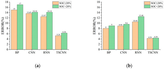 In Figure 15 and Table 3, it can be observed that when the battery SOC was equal to or above 20%, both the max error and the MSE were relatively small, which is better than the corresponding values for below 20%. In the DST dataset, the maximum error of the BP neural network for a battery SOC of above 20% was 2% lower than the corresponding values for one of below 20%. The CNN, RNN, and TSCNN were lower by 0.49%, 1.67%, and 1.02%, respectively. In the UDDS dataset, the max errors for a battery SOC of above 20% were lower than those of below 20% by 1%, 0.66%, 2%, and 0.15%, respectively. Therefore, we conclude that the performance of the neural network deteriorates when the battery SOC is below 20%.