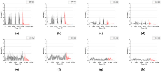 (a) Error of GABP on DST; (b) error of GACNN on DST; (c) error of GARNN on DST; (d) error of GATSCNN on DST; (e) error of GABP on UDDS; (f) error of GACNN on UDDS; (g) error of GARNN on UDDS; (h) error of GATSCNN on UDDS.