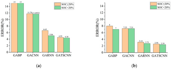 As shown in Figure 17, after using GA optimization, all of the networks achieved excellent SOC estimation performance. Among them, the network with the most significant improvement was RNN, followed by TSCNN. In particular, the GATSCNN network displayed the best performance on both datasets, achieving a max error optimization of 4.45% on DST and 2.58% on UDDS.