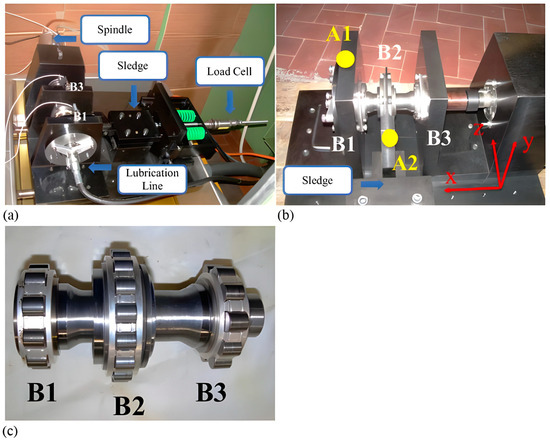 Overview of the test rig and its main components: (a) the test rig; (b) accelerometers’ and reference system’s positions; (c) roller bearing shaft. Reproduced from [7], Elsevier: 2019.