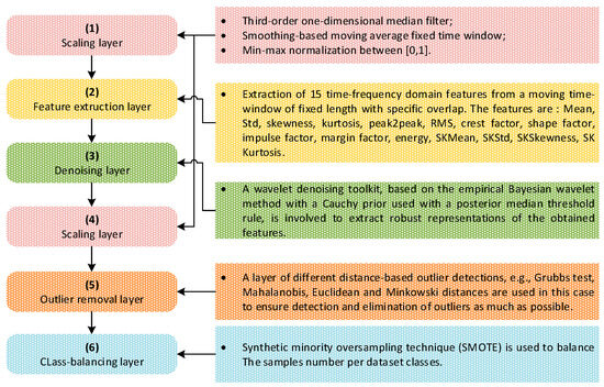 To provide a clean and meaningful feature space to feed into the proposed CSIDTL learning process, a set of well-defined steps are followed, namely, feature extraction, a list of denoising algorithms, a set of outlier removals, filtering, smoothing, scaling, and balancing. Figure 5 addresses this data processing methodology by introducing these steps in the form of six different layers. The order of the presented layers is very important for the process to run smoothly. It should be mentioned that this section and the next ones contain many interesting tools and metrics that are used and discussed. Therefore, describing the mathematical background of these tools and their demonstration is not appropriate for this paper in terms of length and number. Instead, a set of very interesting references already well known in the literature will be cited and referred to when describing these tools. Furthermore, this work concentrates solely on the mathematical background of the innovative new formulas that are the focus of this paper and makes them easy to present for replication in programming terms.