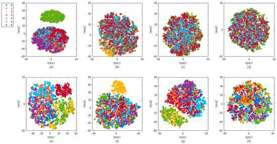 In this context, t-Distributed Stochastic Neighbor Embedding (t-SNE) is used to map high-dimensional data to a low-dimensional space while preserving similarities among data points, with emphasis on distances relative to each other. As a result, the data scatters in Figure 6 are obtained to visualize and explore our dataset. Figure 6a refers to healthy operating modes, low distortions, and less harsh working conditions. There is minimum speed and null load, and the bearings are completely healthy. In this case, it can be observed that samples of different data classes have some pattern agglomeration of different operating modes (e.g., class 4 and class 2) that can be easily distinguished even with a simple linear model. On the other hand, comparing these representations with each other or with other classes clearly explains the complexity of the data, reflected by higher cardinality. Contrariwise, the prepared version in Figure 6e increases this classification capability by showing an additional number of distinguished classes (e.g., 0, 4, 2, 6). This clearly illustrates the efficiency of data processing, especially denoising and removing outliers. It should be mentioned that these details only appear in two-dimensional t-SNE distributions. Thus, it is possible to observe better performance of the proposed data engineering details if we explore three-dimensional data visualization. The same explanation could be projected onto Figure 6b–d when comparing them to their prepared version in Figure 6f–h. This clearly shows that data engineering helps to reveal some important patterns in the data that are hidden in the original feature spaces. Finally, further mapping processes using CSITDL could improve representations of feature spaces.
