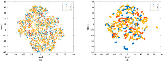 Concerning the endurance test, the experiments show regression in the long-term damage of bearing 4A. This means that the data are highly correlated and the propagation of damage is regressive and slow. Therefore, as the experiment is related to damage severity, the correlation among samples is higher, while it is more difficult to highlight the different patterns of each health stage separately. In this case, we modify the outlier removing layer using a loop, repeating the process over and over for 20 times while also increasing the span of the time window to 50 samples. In another way, no matter the complexity of the diagnosis problem in the first experiment of variable speed and load, the endurance test resembles a set of very complex data scatters with further complexity. Figure 7a represents the original feature space, reflecting a mixture of data patterns and a higher level of complexity. By comparing it with the prepared version, the data representations seem a kind of agglomeration of samples holding some similar patterns. It is actually a very positive indication that the data engineering process helps to process data classes and uncover hidden patterns. An additional comparison between data in the endurance test and variable-speed and -load test can be made in this case. If we compare the raw and prepared data of the first version with those of the second one, it is clearly confirmed that the endurance data are more complex, as previously indicated. In other words, the model reconstruction process also requires further abstractions in this case than in the variable-speed and -load experiment. The agglomeration of the samples shown in Figure 7b is caused by continuous smoothing and filtering as a result of repeating the scaling layer several times, thus allowing similar patterns to be grouped together, thereby improving the quality of the data.
