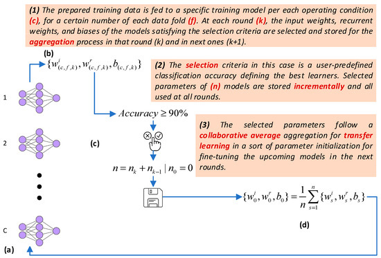 Schematic diagram of the proposed CSIDTL approach: (a) training a set of learning models separately for each operating condition; (b) using the cross-validation technique to evaluate model performance; (c) selecting and storing the learning parameters of the best learners based on accuracy; (d) unleashing the aggregation process only for selected parameters and determine initial parameters of following rounds.