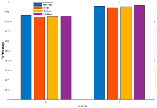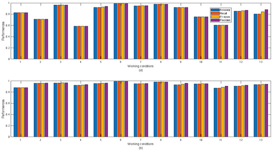 In this work, we launched two experiments on two subsets of the dataset using a laptop with a four-core i7 microprocessor, 16 GB RAM, and 12 MB cache memory. In the first experiment of “variable speed and load”, the CSIDTL algorithm was run for five particular rounds in an amount of time of 5.9170 h. Since the process is very slow, there is a small chance of involving random search algorithms and the grid search mechanism for hyperparameter tuning. Therefore, the LSTM network parameters were manually tuned based on an error-and-trial basis instead. Three-fold cross-validation was involved in studying the performance of the proposed approach, while well-known metrics, such as , , , and , were used to evaluate the performance of the training process. For the mathematical background and significance of these metrics, please refer to the paper [27]. During the evaluation, we focused on collecting testing performance, as it is very important to assess both the approximation and generalization capabilities of learning models. The selection of the best learners was constrained by . All trained models of three-folds were involved in the transfer learning-based selection and aggregation process, while the resulting illustration of each model per condition is the average value of the values obtained from the results. Accordingly, a single-layer LSTM network with 40 neurons, regularization parameter = 1 × 10−4, initial learning rate = 1 × 10−2, minibatch size of 200 samples, and the maximum number of epochs of 600 was adopted for the used hyperparameters. After the training process, the best results were collected and labeled as best-round training. It should be mentioned that the results, in this case, were numerous, as a matrix of 4 × 13 elements was obtained per round. Additionally, about 13 × 3 × 5 confusion matrices were analyzed in this case. Therefore, an average of the entire matrix was used to better illustrate and compare global results, because it is difficult to showcase such numerous results.
