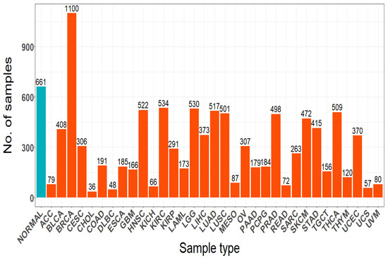 The R/Bioconductor package RTCGA Toolbox package [24] is used to retrieve the Pan-Cancer Atlas RNASeq gene expression data via the TCGA Firehose Data. The obtained data contains 10,456 samples from 33 tumor types with their corresponding normal samples and it has 20,501 genes in total. The gene expression data was log2 transformed using the formula . Thereafter, dataset undergoes normalization and filtration processes, which reduced the number of genes to 15,271. Figure 1 presents the number of sample in each cancer type.