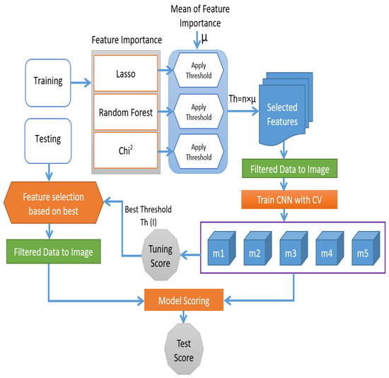 Figure 2 depicts the complete framework of our proposed method. First, we divided the entire data into testing and training sets before processing it with feature selection algorithms to prevent data leakage and model overfitting. Then, we applied feature selection procedures to the training set. This way, we will ensure no information is shared between the training and testing sets when applying the features selection algorithm. Suppose feature selection is used to prepare the data, followed by model selection and training on the chosen features. In this case, the model will be given the training set as a whole for making feature selection decisions. This could lead to models that are improved by the chosen features over other tested models appearing to have better results when they have biased results [25]. Three feature selection techniques are used. These techniques are Lasso, Random Forest, and Chi-Square. These feature selection techniques are essential because they can identify the most important features that strongly impact the target variable and remove the less important features. We calculated the feature importance of each selection method. Then we calculated the mean of the feature importance to determine the threshold for selecting the most relevant features, which are then reshaped into 2D-image-like data. The thresholds that we used in this research are µ, 0.5 µ, 2 µ, 4 µ, and 8 µ and they are used to create five classification models. These classification models are trained based on a 10-fold cross-validation approach.