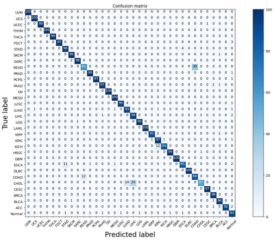 The proposed model Confusion matrix on 33-tumor type in addition to the normal samples.