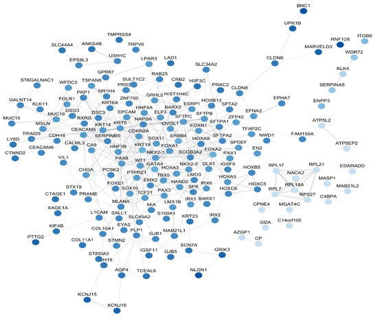 The WT1 gene encodes the crucial transcription factor for normal cellular growth and cell survival, according to Yang, L. et al. [50]. A tumor suppressor gene called WT1 has mutations that have been associated to kidney cancer development and urogenital disease. It was first identified as the causal gene in an autosomal-recessive syndrome. Non-small cell lung cancer (NSCLC), particularly lung adenocarcinoma (ADK), has enhanced expression of NKX2-1, which is an essential molecule in lung development, according to Moisés et al. [51]. In addition, the authors of [52,53] found and evidence suggests that NKX2-1 and TTF-1 play opposing roles in the initiation and progression of lung cancer. These findings may also apply to thyroid tumors and hematological malignancies.