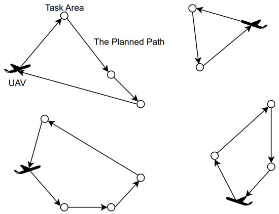 - The task assignment set of the UAV.Different UAVs are assigned to different tasks, and the task set defined as stores the tasks assigned to the i-th UAV. Here, represents the number of tasks in the task set.