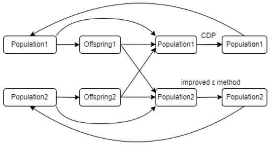 - MTCMO Algorithm Flow.The main process of the MTCMO algorithm is illustrated in Figure 4. Firstly, two populations with NP individuals, denoted as , and , are randomly initialized in the search space. Each individual represents a set of decision variables, that is, an allocation scheme. Next, the two parent populations and use the Multi-objective Evolutionary Algorithm (MOEA) operator to generate offspring populations and with NP/2 individuals, respectively. Subsequently, for , after mixing , and , using the algorithm calculating according to Formula (12), the top NP individuals are selected as the new based on CDP. As for , after mixing , and , using the algorithm setting according to Formula (13), the first NP individuals are selected as the new using the improved method. The above process represents one generation in the evolution, so the above process is iterated until the preset maximum evolution generation is reached, thereby obtaining a series of optimal decision variables and ultimately attaining the optimal static task pre-allocation scheme.