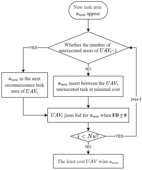 where represents the reconnaissance time allocated by the UAV to the task area before the new task appears, and is the reconnaissance time needed to meet the minimum reconnaissance revenue of the task area, and is the minimum reconnaissance time of the new task area. The UAV is eligible to compete for the task area only if . Otherwise, UAVs with abandon competition for the new mission areas. If the of each UAV is less than 0, the problem is considered unsolvable.