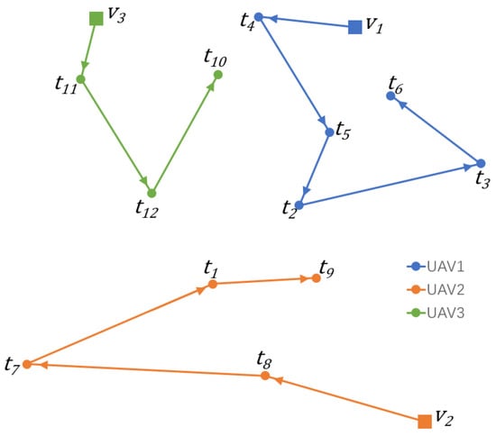 After obtaining the solution, we apply the 2-optimization (2-opt) [] operator to locally optimize the reconnaissance sequence q, thereby preventing the intersection of flight paths.