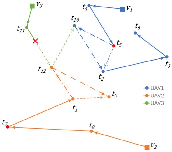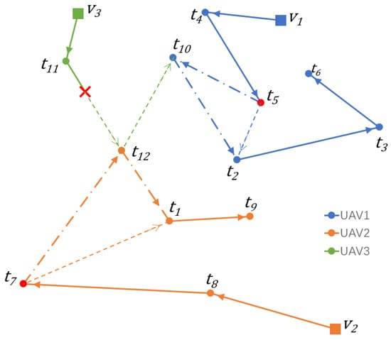 Diagram of task planning for the traditional assignment model with reduced UAV. (Red dot—UAV positions when contingency, red-cross—deleted UAV, dashed line—cancelled initial flight path, dotted line—added new flight path, same below).