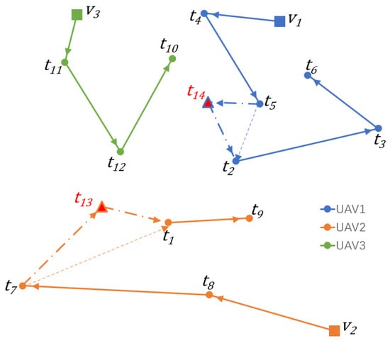 Diagram of task planning for the traditional assignment model with added task areas. (Red dot—UAV positions when contingency, triangle—new task area, dashed-line—cancelled initial flight path, dotted line—added new flight path, same below).